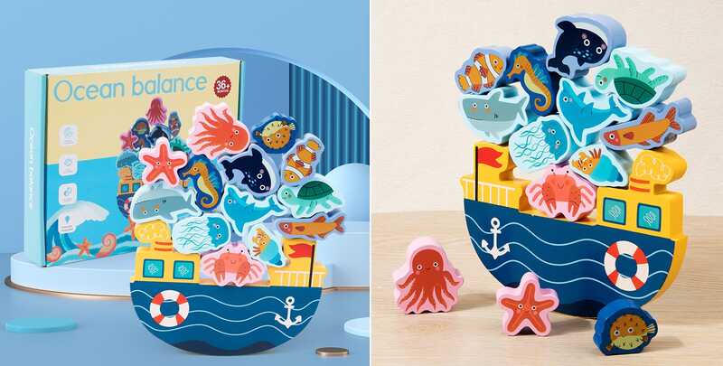 Милий дерев’яний балансир із морськими тваринками перетворює гру на захопливе змагання зі спритності та рівноваги!