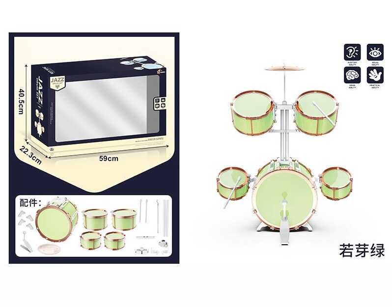 Набір має сучасний дизайн та складається з кількох барабанів, тарілок та педалі — усе, як у дорослих інструментів, але в легкому й зручному дитячому форматі.