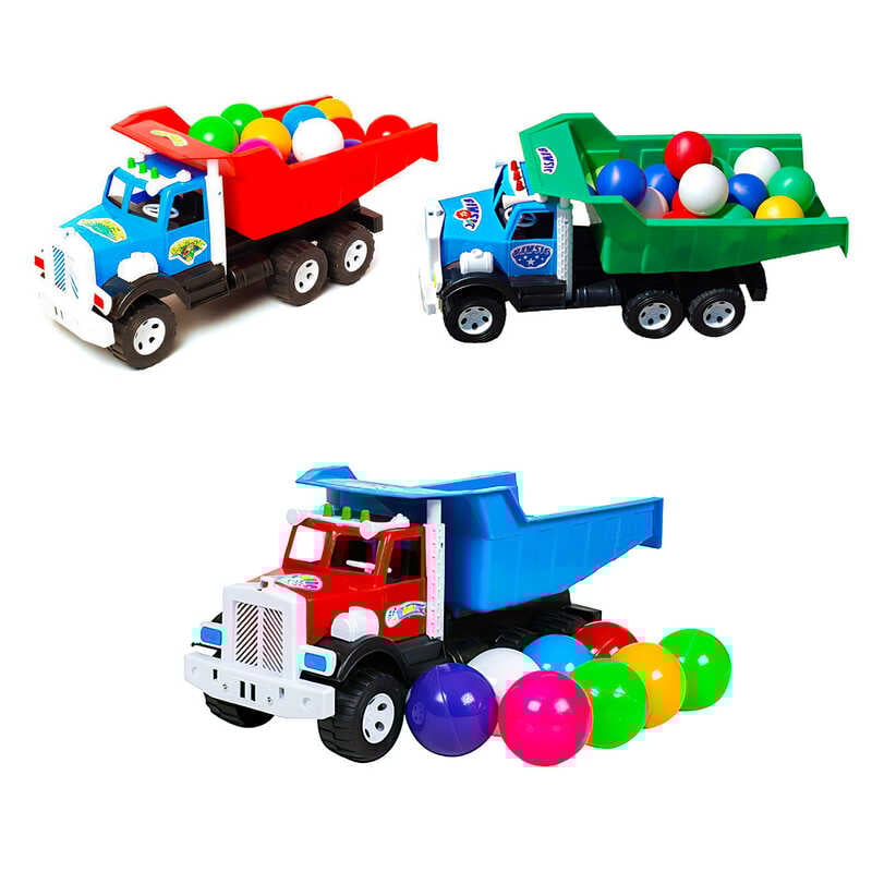 Яскравий самоскид з відкидним кузовом наповнений яскравими пластиковими кульками (тверді, 8 шт., Діаметр - 8 см) Виконаний з пластмаси.