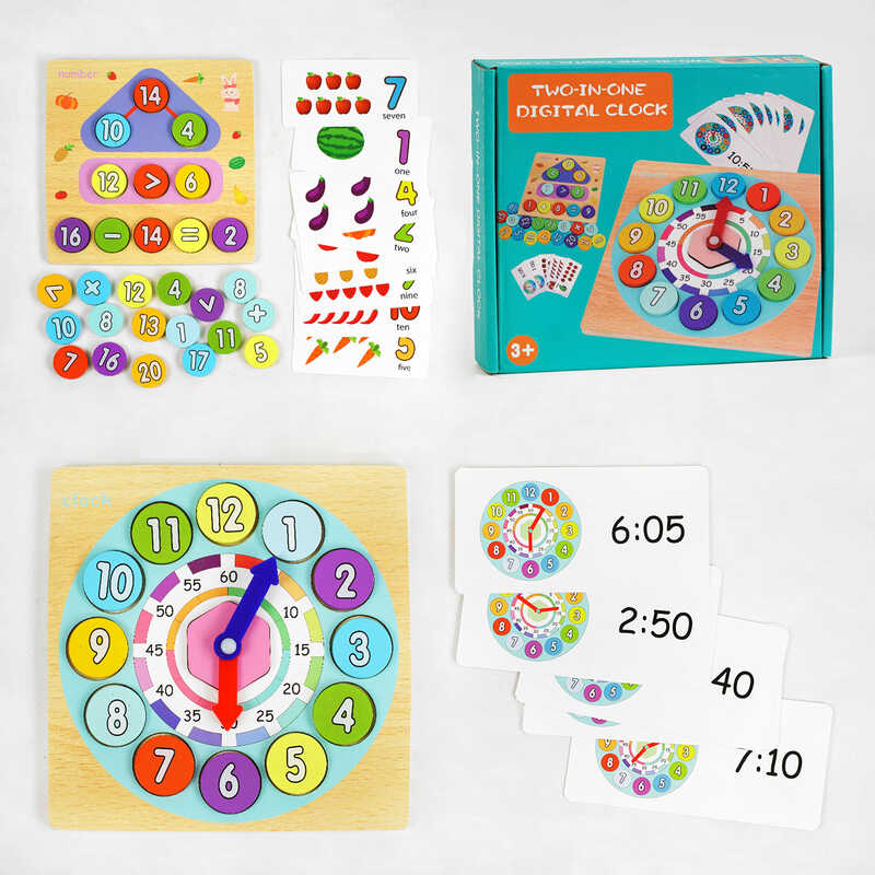 - в наборі ідуть картки, дерев’яні фішки з цифрами та математичними знаками (множення, ділення тощо), дерев’яна фігурка зі стрілками, дерев’яний планшет зі зображенням циферблата;