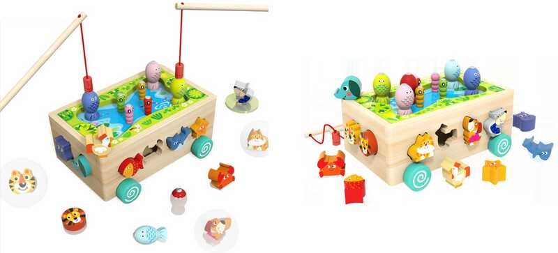 Ця багатофункціональна дерев’яна іграшка об’єднує одразу кілька цікавих занять, що надовго захоплять малюка! Дитина зможе сортувати фігурки за формою, кольором і персонажами, ловити рибок за допомогою магнітної вудочки та вправлятися у координації. Завдяки зручній формі всі елементи легко зберігати. Іграшка розвиває моторику, логіку, уважність і фантазію.