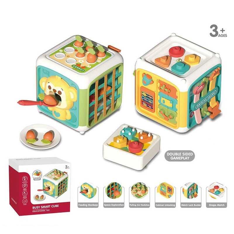 Розвивальний куб — це багатофункціональна іграшка, що об’єднує кілька різних активностей. Малюк зможе “годувати” мавпочку, сортувати фігурки та досліджувати рухомі елементи. Іграшка сприяє розвитку дрібної моторики, логічного мислення, координації та уваги дитини.
