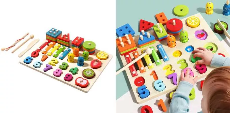 Дитина зможе сортувати фігури та цифри, тренувати моторику через нанизування фігур на кілочки і навіть грати у магнітну риболовлю, ловлячи кумедних рибок спеціальною вудкою.