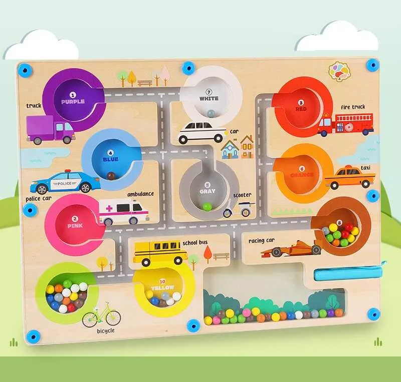 Ця дерев’яна магнітна гра із кульками подарує дітям захопливу подорож, де потрібно керувати рухом маленьких різнокольорових кульок за допомогою магнітного стилуса! Малюк веде кульки лабіринтом та сортує їх за кольорами.