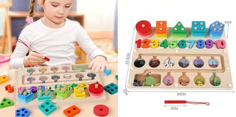 Дитина зможе сортувати цифри, тренувати моторику через нанизування фігур на кілочки і навіть розважатися з магнітною грою, сортуючи кульки спеціальним магнітним стилусом.