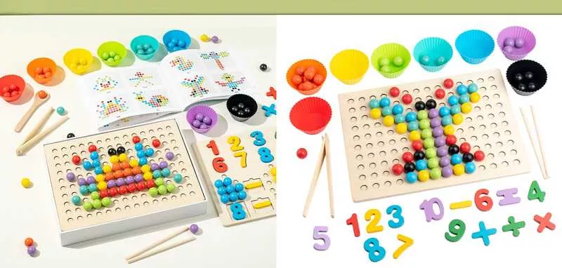 Математична дошка перетворює навчання у яскравий, захопливий процес! Малюк збирає кольорові зображення з кульок, повторюючи зразки на картках, виконує приклади та знайомиться з цифрами й кольорами.
