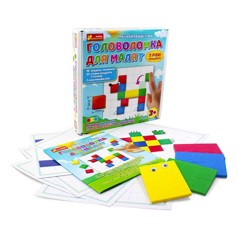 Як грати: дитина викладає квадратики на яскравий малюнок, називаючи кольори. А щоб малюнок "ожив", додаємо до нього оченята. Готово! Називаємо, хто у нас вийшов, песик, черепаха чи інші тваринки.