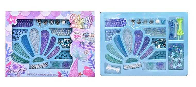 Цей чарівний набір бісеру — справжній скарб для юних дизайнерів! Усе упаковано в яскраву коробку у формі морської мушлі, що надихає на творчість. Створи понад 20 унікальних прикрас: браслетів, кольє, кілець або брелоків. Яскраві намистини, зірочки, перлинки та шнурочки перетворять кожну ідею на витвір мистецтва.