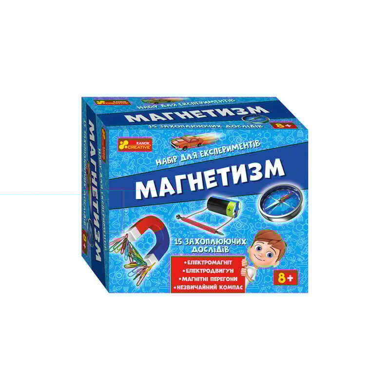 Привіт, експериментаторе! Готовий до нових відкриттів та незвичайних дослідів? Тоді поїхали! Чи знаєш ти, що таке електромагніт та електродвигун? Ні? То не біда! Ти змайструєш його власноруч! Та це ще не все! Запроси друга і проведи «магнітні» перегони зроби так, щоб магнітний порошок рухався, утворюючи візерунки, піймай кольорову рибку магнітною вудкою! Досліджуй властивості магніту та ставай ще розумнішим. Уперед!