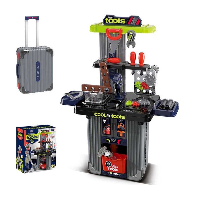 Велика валіза-майстерня “Cool Tools” — це мрія кожного маленького майстра! Вона легко розкладається у функціональний верстат із полицями, гачками та робочою поверхнею для інструментів. У комплекті: пилка, викрутки, гайковий ключ, болти, гайки та багато інших аксесуарів для гри.