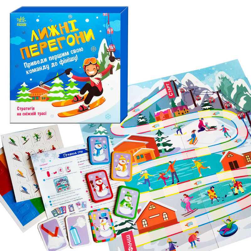 Настільна гра для всієї родини! Популярний формат ігор-бродилок втілено у цікавій захопливій грі з зимовим сюжетом. Чия команда будет першою на фініші? Хто вдало подолає перешколи, уникне зламаних лиж та спритних суперників? Треба зіграти та дізнатися!