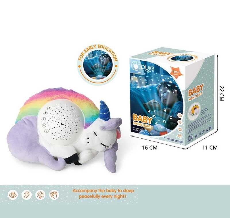 Текстильний нічник «Єдиноріжка» — м’який друг, що допомагає малюкові спокійно засинати. Іграшка поєднує ніжне світло, музику та заспокійливі природні звуки, створюючи чарівну атмосферу для сну. На стелю проєктується зоряне небо, а підсвічування змінює кольори, додаючи затишку дитячій кімнаті.