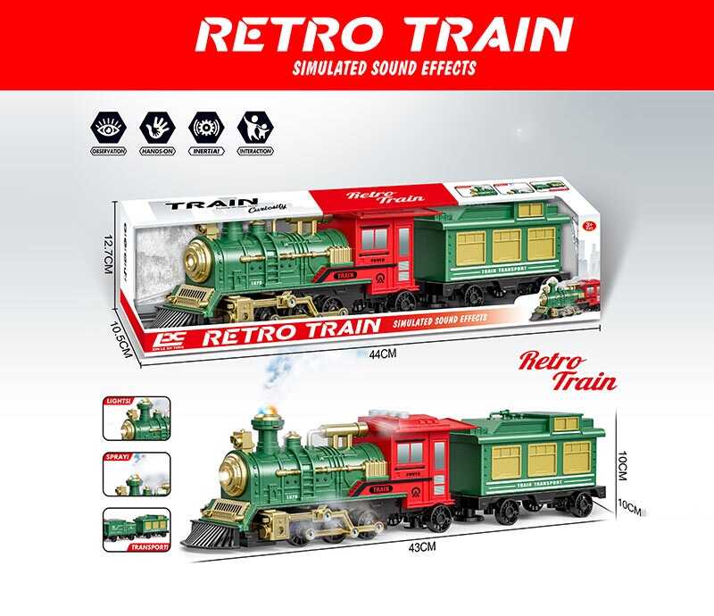 Ретро-потяг із вагоном — стильна іграшка, що подарує відчуття захопливої подорожі! Модель має інерційний механізм, реалістичну парогенерацію, підсвічування та звуки потяга, які вмикаються кнопками на даху. Такий потяг стане прикрасою будь-якої дитячої колекції й подарує безліч яскравих моментів!