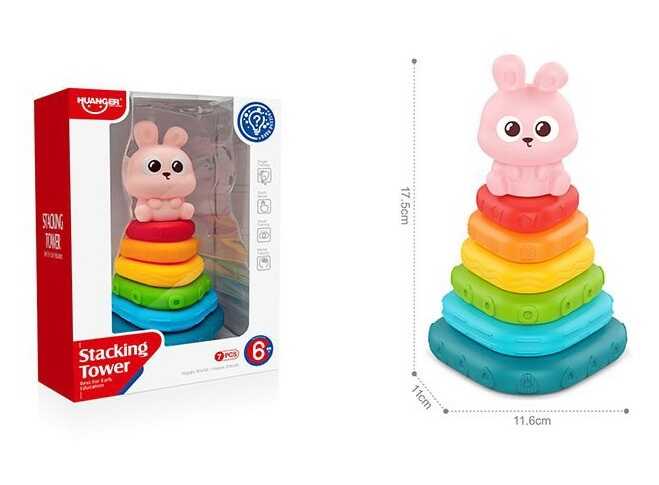 Ця яскрава пірамідка із кроликом одразу привертає увагу малюка й заохочує до гри. Дитина із задоволенням збирає кільця, вивчає кольори та знайомиться з формами у простому й зрозумілому ігровому форматі. Верхівка з милою фігуркою кролика робить пірамідку ще цікавішою. Під час складання малюк тренує дрібну моторику, координацію рухів і логічне мислення.