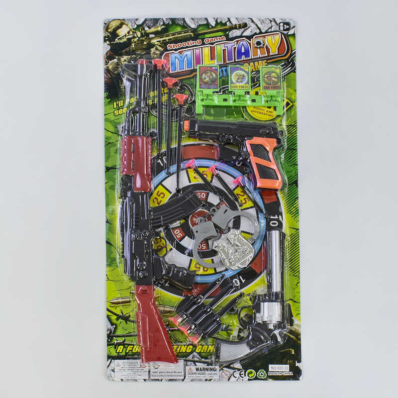 У комплект набору входять різні види зброї на присосках (рушниця, пістолет, револьвер), мішені та наручники.